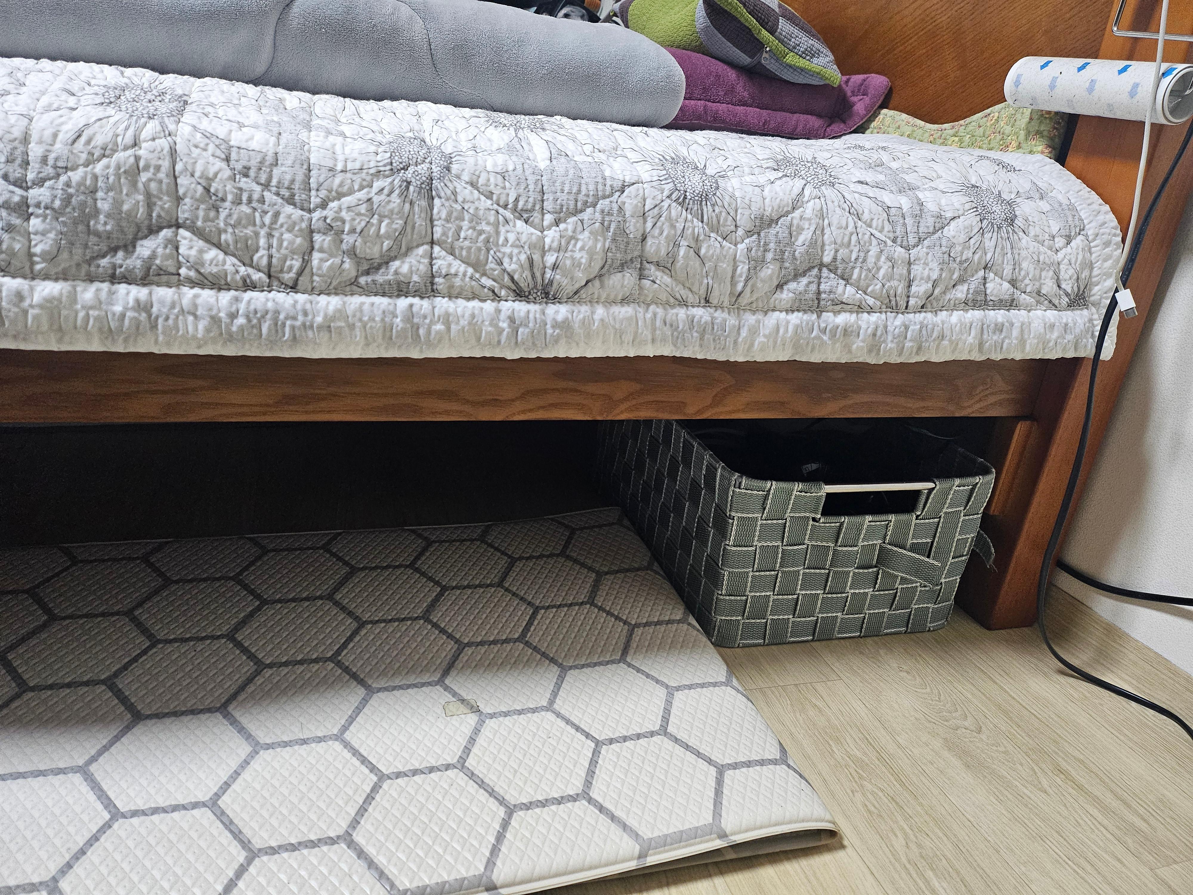 침대 아래에는 어딘가 쑤셔 넣은 박스가 자리한다.