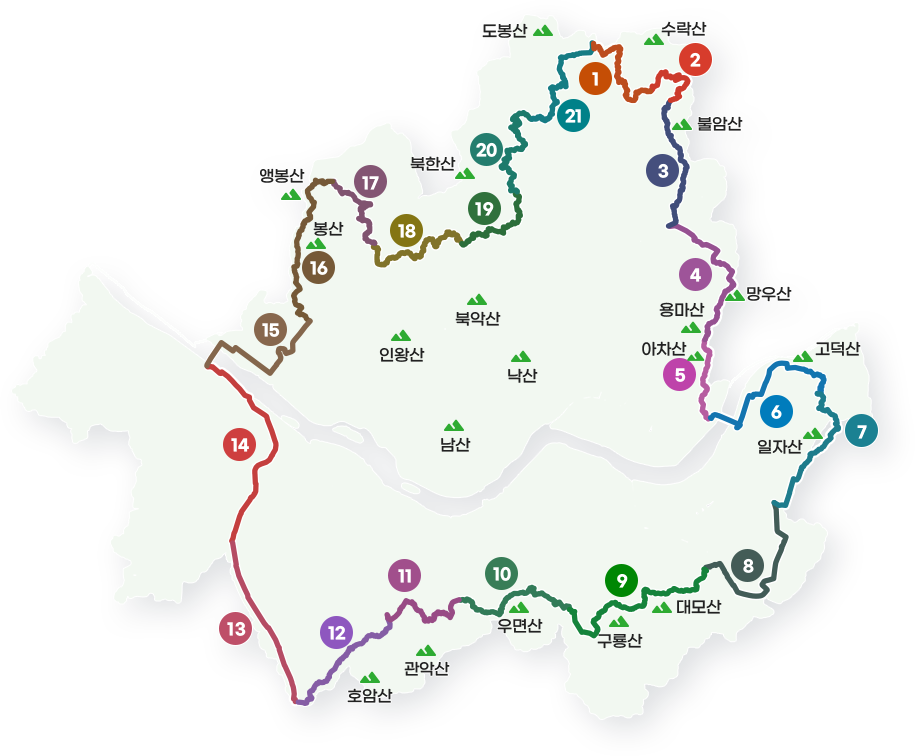 둘레길 21개 코스를 지형과 역사적 특성에 따라 4가지 카테고리로 분류했습니다.