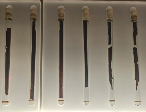 유리관 안에 가지런히 놓인 대나무 조각들에는 정교한 한자가 새겨져 있었고,